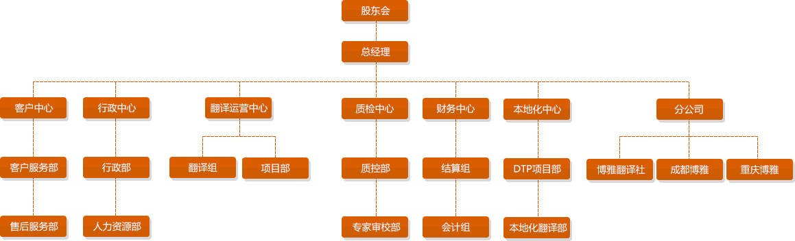 博雅翻译包括博雅翻译社、成都译联博雅翻译有限公司、重庆博雅翻译服务有限公司、博雅(深圳)多语言翻译有限公司、上海朗传翻译有限公司以及各地分支机构,公司翻译团队现由160余名专职译员、14位高级项目经理,12位资深专家审校、16位外籍译员组成。英语译员均具有10年以上翻译经验,其他语种译员均具有5年以上翻译经验。同时,还同国外100多家翻译公司签订了合作协议,实现优势和语种互补。公司已实现翻译队伍的专业化、集团化和规模化,从而保证在较短时间内,向客户迅速交付合格的翻译稿件,满足不同客户的要求。 自公司成立以来,我们的翻译团队和客户服务团队以专业的翻译、贴心的服务做到了客户对公司的“零投诉”,真正做到了客户满意品牌。