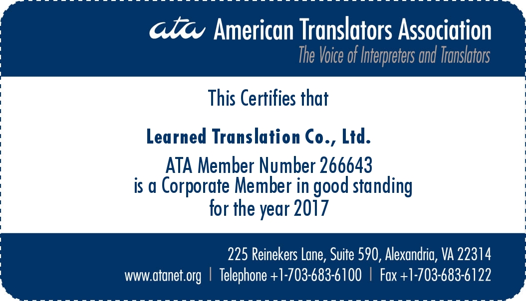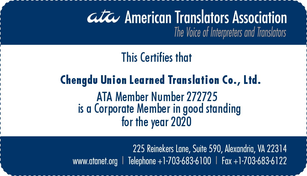 博雅翻译公司是美国翻译协会(ATA)会员,是美国政府认可翻译机构。